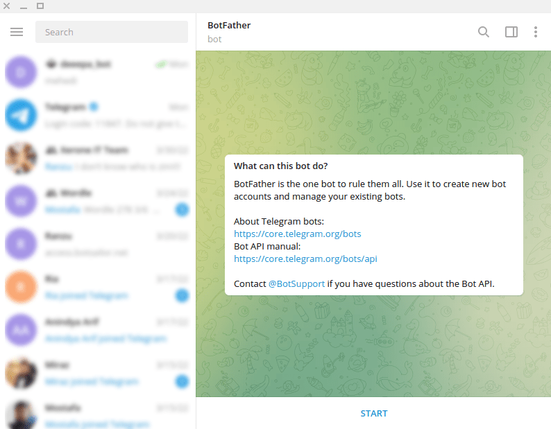 To build a Telegram bot with Company Name, first, open your Telegram App. Then in the search bar of the app, search with the ‘BotFather’ keyword. Then select the verified BotFather account.